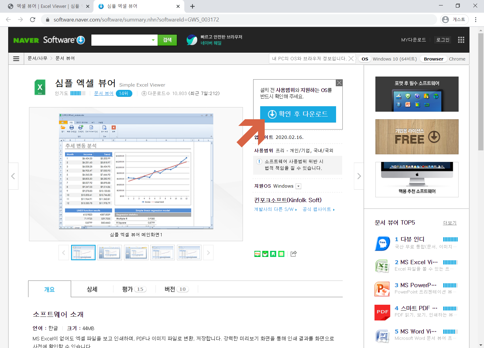 네이버 소프트웨어 자료실로 이동하면 심플 엑셀 뷰어를 다운로드 하실 수 있으며, 페이지 하단에 링크를 정리하였습니다. <무료 다운로드>를 눌러주세요.