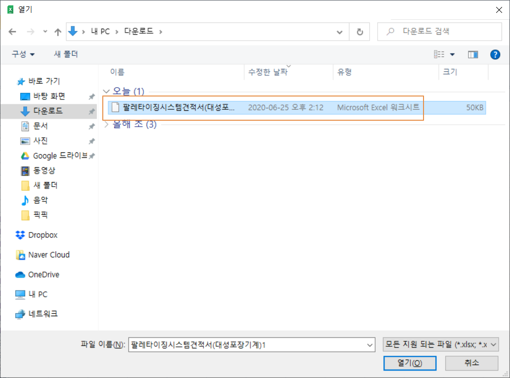 최근 엑셀 파일을 열어보려 합니다. 엑셀 파일을 선택하고 <열기>를 누릅니다.