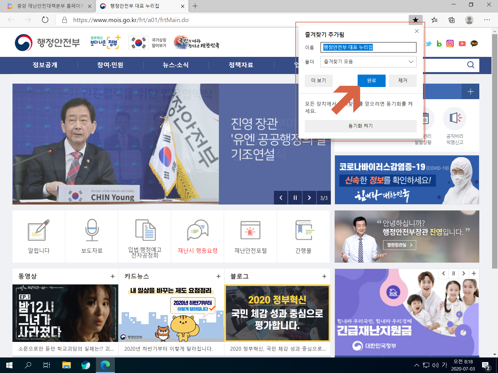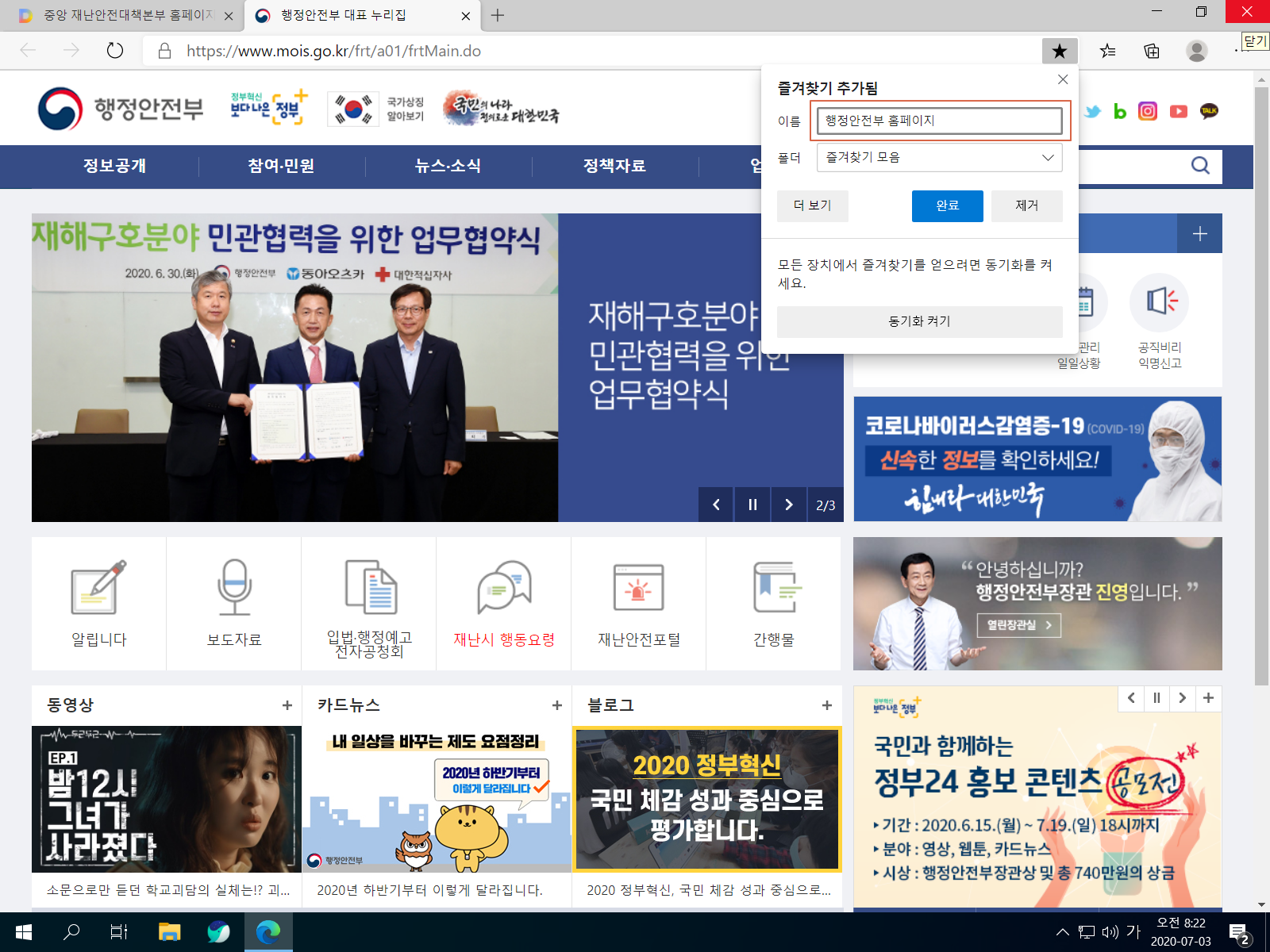 행정안전부 홈페이지가 나타났습니다. 주소 표시줄 옆에 역시 별표가 활성화되어 즐겨찾기에 저장되어있다는걸 알 수 있습니다.