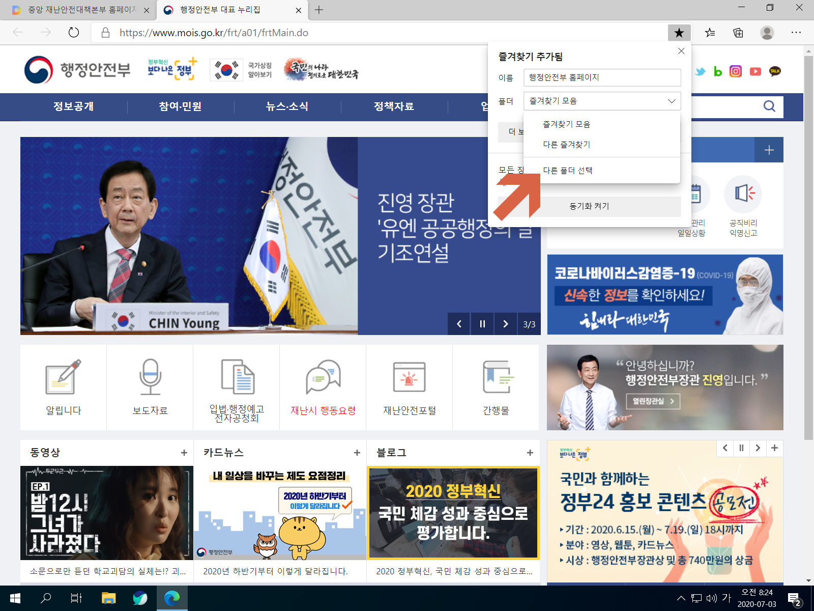 이제 즐겨찾기를 통하여 위에서 즐겨찾기 추가된 행정안전부 홈페이지로 이동해 보려 합니다.