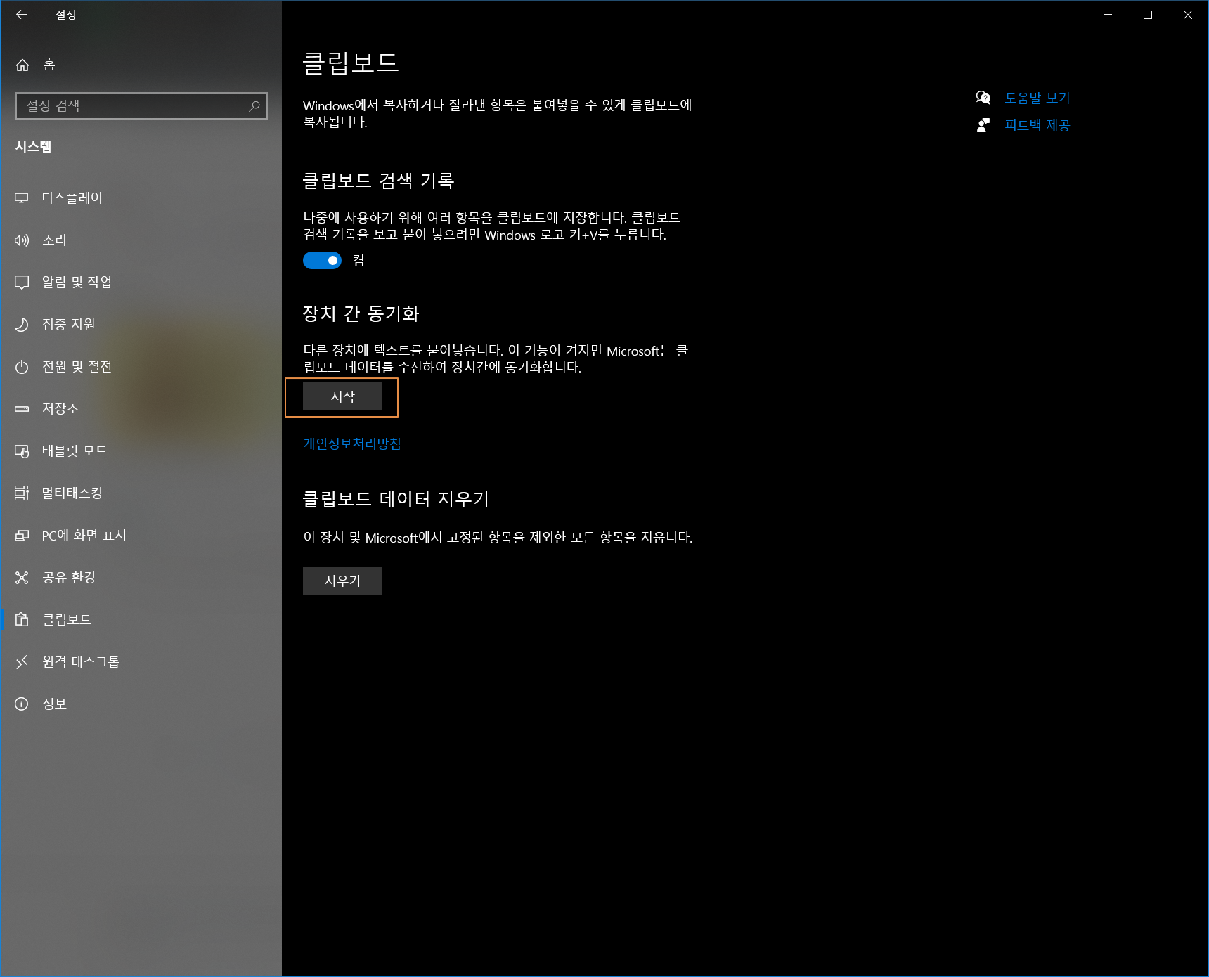 장치 간 동기화에서 <시작>을 눌러서 동기화 설정을 하시면 클립보드 내용이 클라우드를 통해 다른 장치에서도 사용이 가능합니다만, 현재는 모바일은 동기화가 되지 않고 있습니다. 앞으로 활용 영역이 더 늘어날 걸로 예상되고 있습니다.
