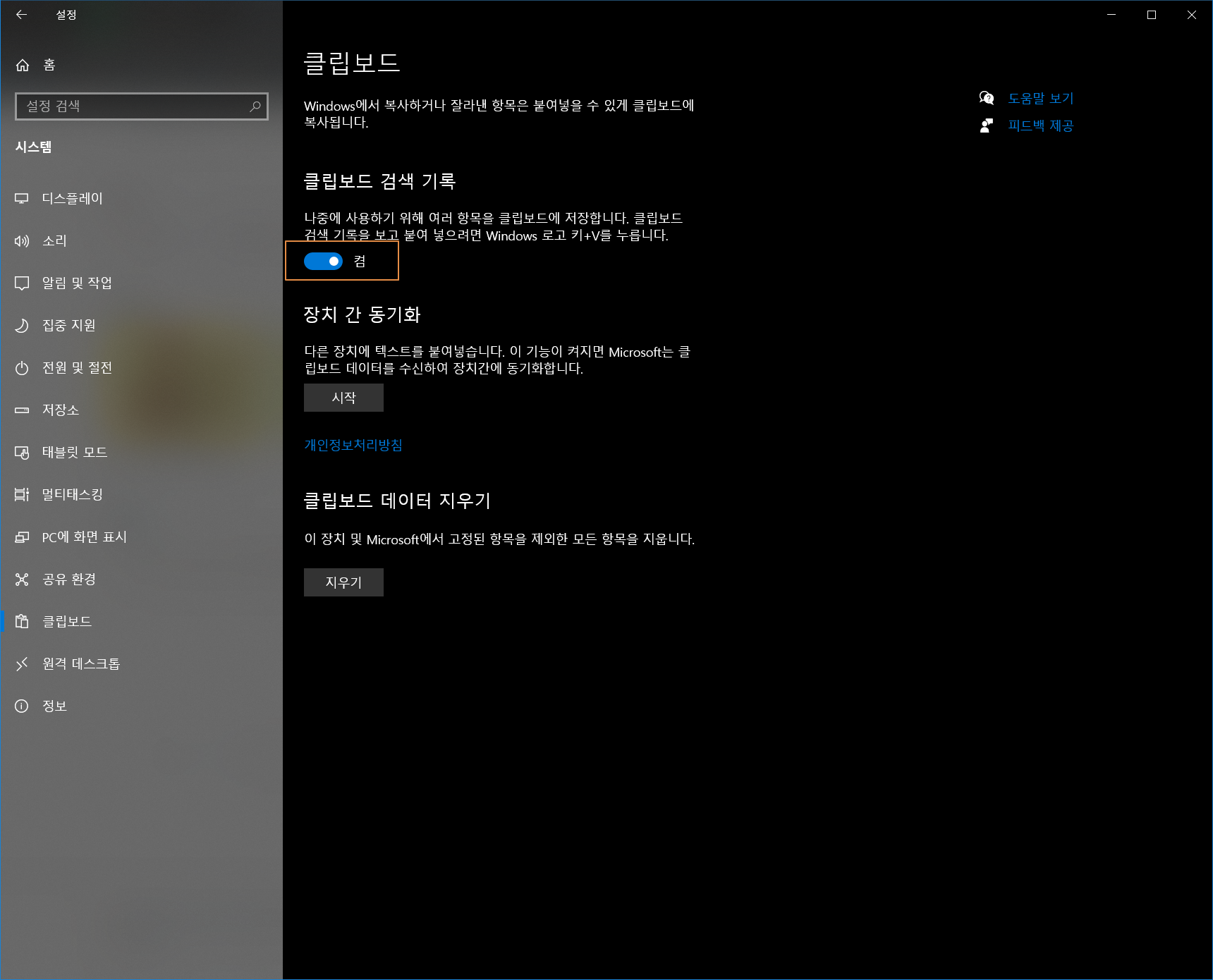 클립보드 검색 기록에서 <켬>을 선택합니다. 기본 설정이 <켬>으로 되어 있으므로 확인만 해두시면 될 듯합니다.