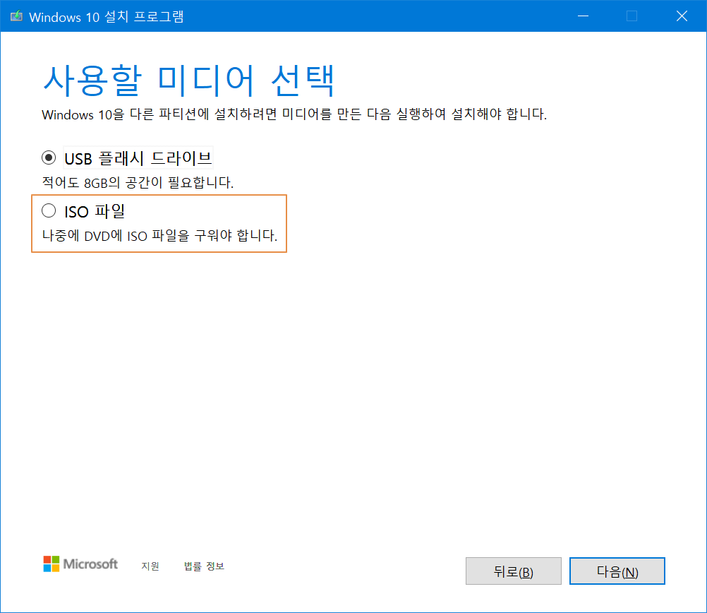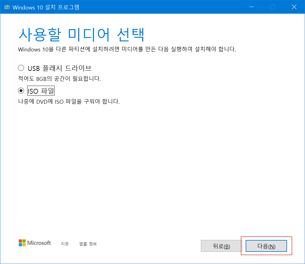 USB 플래시 드라이브를 체크하고 진행하면 실제 PC에 설치가 가능한 윈도우10 미디어를 만들 수 있습니다만, 여기서는 <ISO 파일>을 체크하여 진행하겠습니다.
