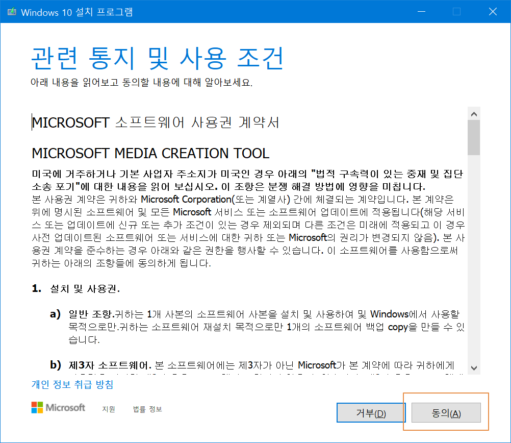<동의>를 누릅니다. 거부를 누르면 실행이 종료되어 동의를 눌러야 할 수밖에 없습니다.