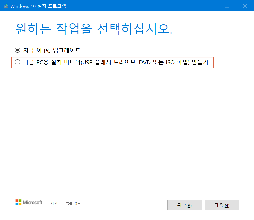 여기서 <지금 이 PC 업그레이드>를 체크하면 실행하고 있는 현재의 PC가 업그레이드가 됩니다. 만약 윈도우7에서 윈도우10으로 변경하고자 할 때 체크하고 진행하시면 운영체체 업그레이드가 가능합니다.