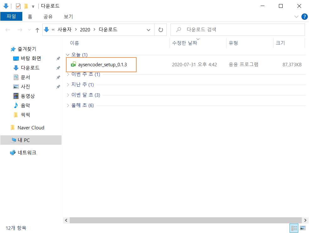 다운로드가 완료되면 내려받기 폴더로 이동합니다. 설치 파일이 보이면 실행을 합니다.