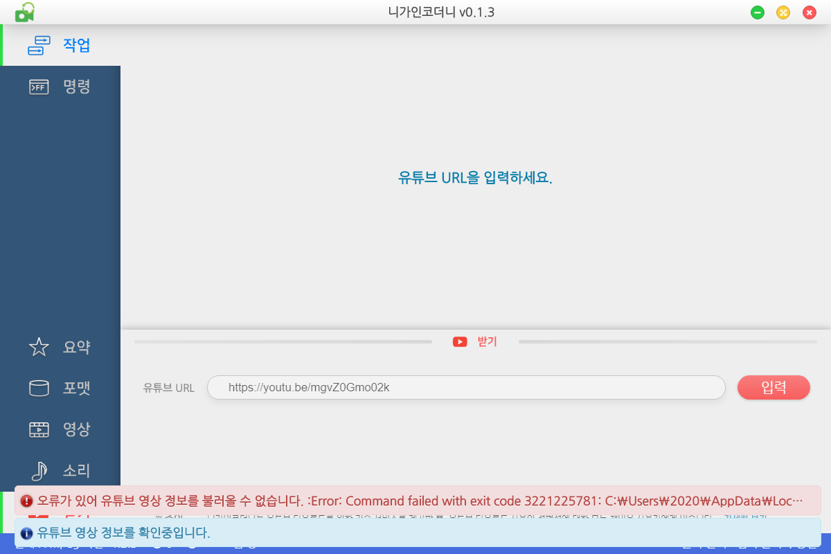 유튜브 주소를 입력하고 <입력>을 누르면 다운로드가 진행되는듯 합니다.