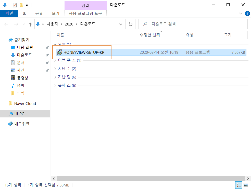 꿀뷰 설치 파일이 보이며, 설치 파일을 <실행>합니다.