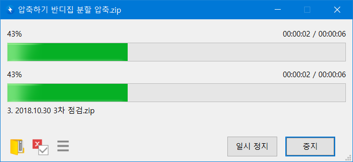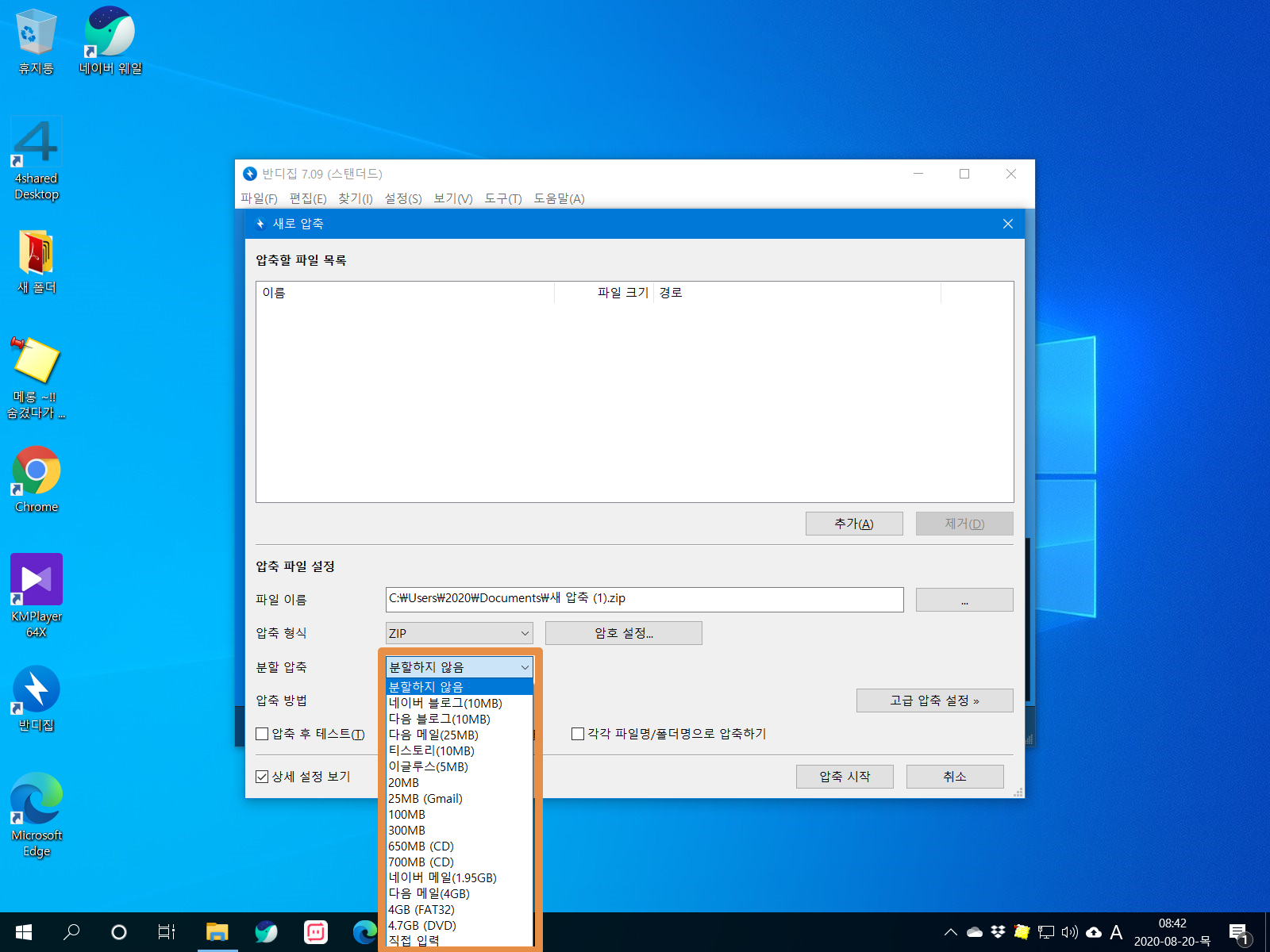 반디집 압축하기 창이 열리고 분할 압축이 실행됩니다.
