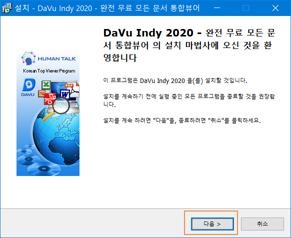 설치 프로그램이 시작되었습니다. <다음>을 누릅니다.