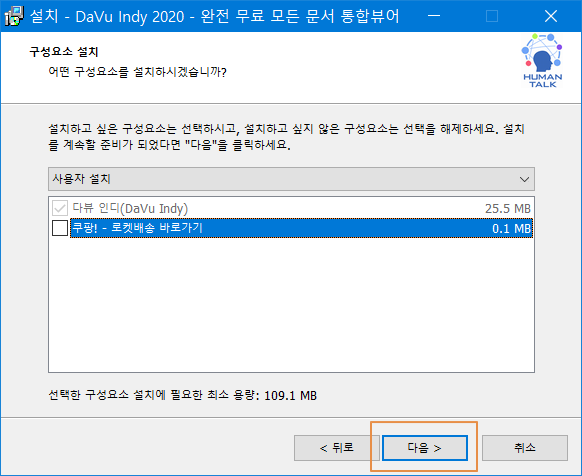 <인공지능(AI) 인터넷 사용 도우미 설치>, <쿠팡! - 로켓 배송 바로가기>의 체크를 해제합니다. 물론 같이 설치하면 유용하게 사용하겠지만 나중에 필요할 때 설치해도 되므로 일단 제외합니다.