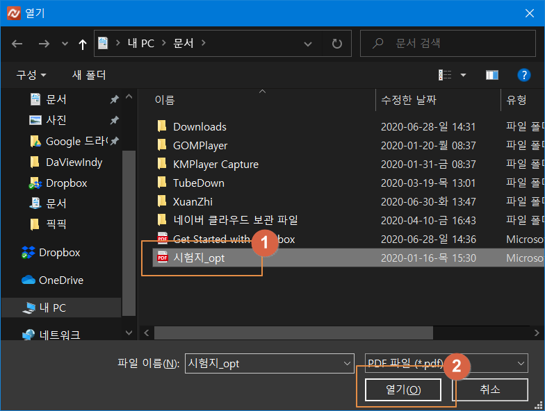 초기 화면에서 열기를 눌러서 1번 PDF 파일을 선택하고 2번 <열기>를 누릅니다.