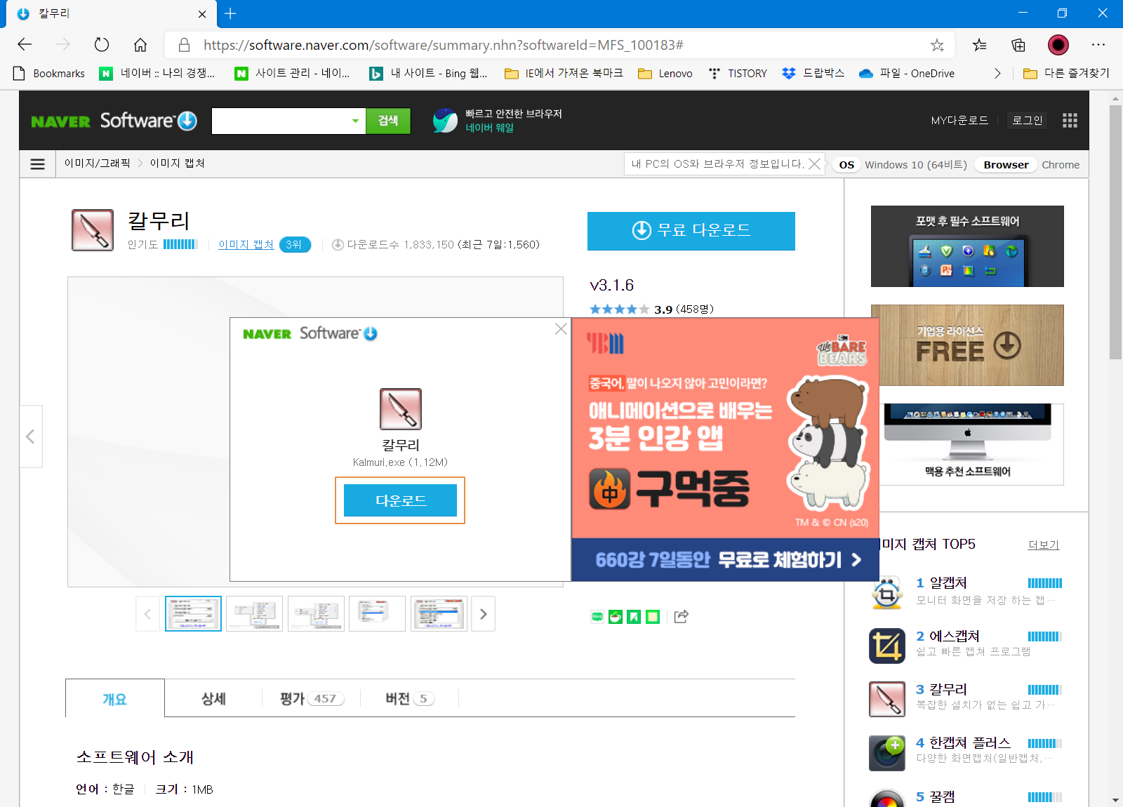 네이버 소프트웨어 자료실의 칼무리 페이지로 이동합니다. <무료 다운로드>를 누릅니다.