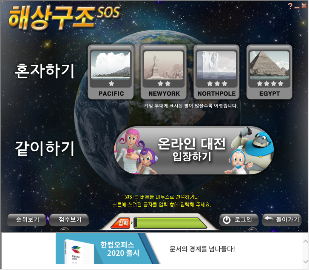 해상구조SOS 게임입니다. 혼자하기하고 같이하기가 있으나 같이하기하시려면 로그인하여야 합니다.