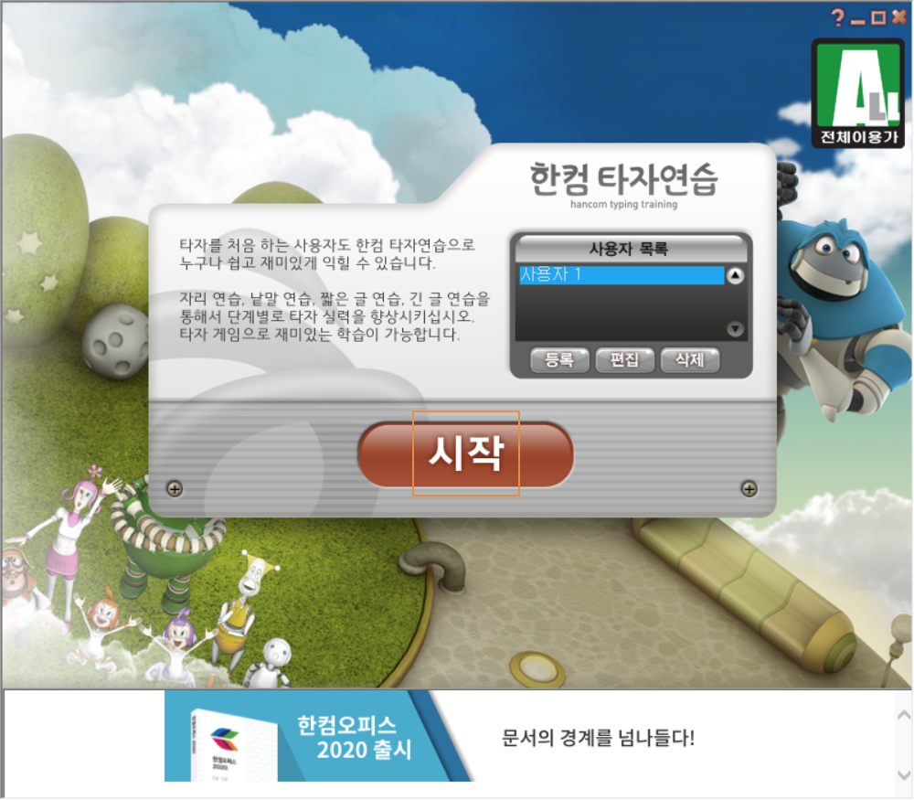 한컴 타자연습은 타자를 처음 하는 사용자도 쉽고 재미있게 익힐 수 있습니다. <시작>을 누릅니다.