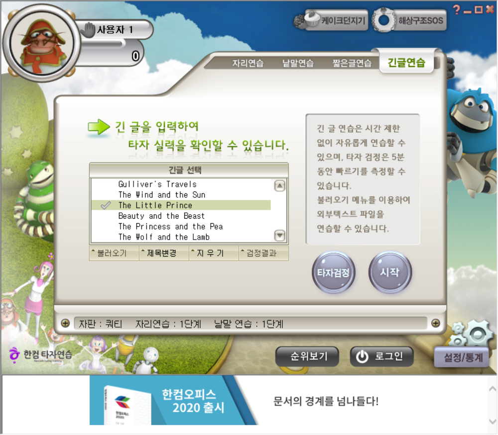 한컴 타자연습 소개할 필요가 없을 만큼 유명한고 널리 알려진 타자연습 프로그램입니다. 타자 게임도 유명했었죠. 마치 캐주얼 게임 같은 느낌의 연습의 지루함을 날려줄 수 있는 꼭 필요한 타자게임이 포함되어있습니다.