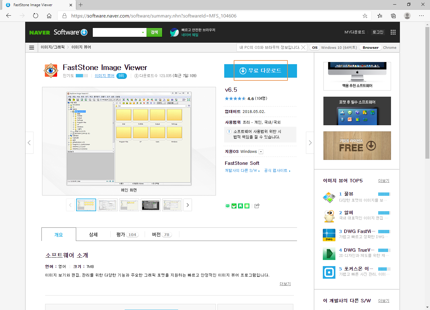 패스트 스톤 이미지 뷰어(FastStone Image Viewer) 다운로드 페이지로 접속합니다. <무료 다운로드>를 누르세요.