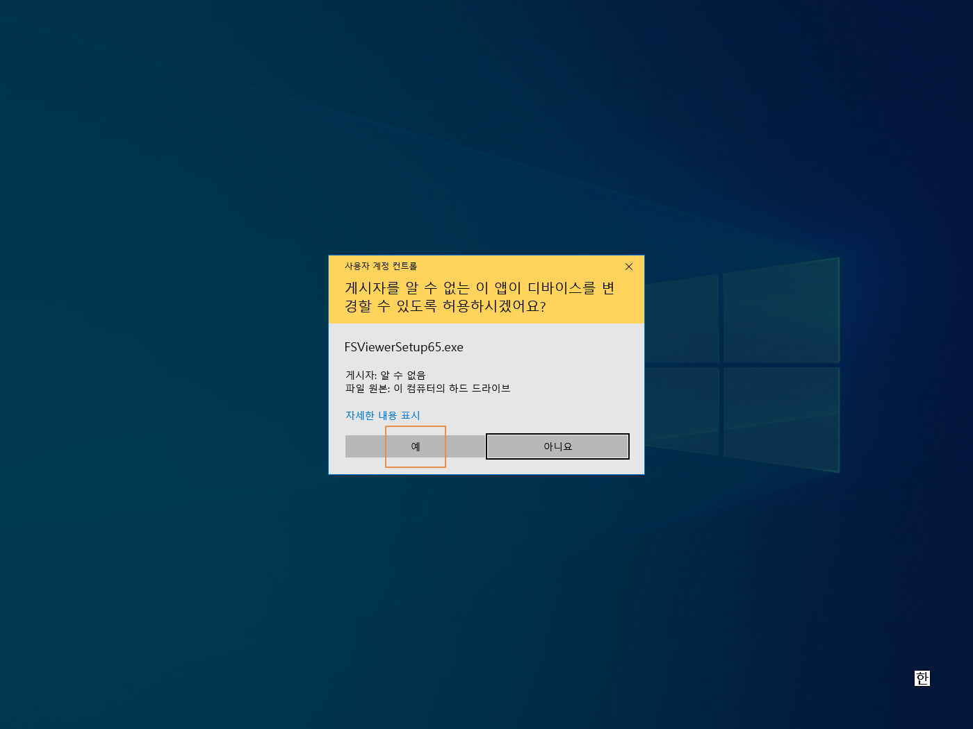 사용자 계정 컨트롤이 열리면 <예>를 누릅니다.