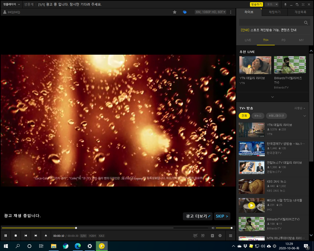 카카오TV 를 실행해 보았습니다. 역시 화질이 좋고 깨끗하게 잘 나옵니다.