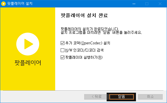 <추가 코덱(OpenCodec) 설치>에 체크를 하시는 게 다른 외장 코덱을 사용하시지 않는다면 꼭 필요합니다. <닫음>을 누릅니다.