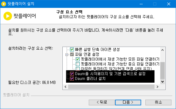 <Daum을 시작페이지 및 기본 검색으로 설정>과 <Daum 클리너 설치>를 체크 해제하시면 시작페이지가 변경되지 않으며, 추가 프로그램이 설치되지 않습니다.