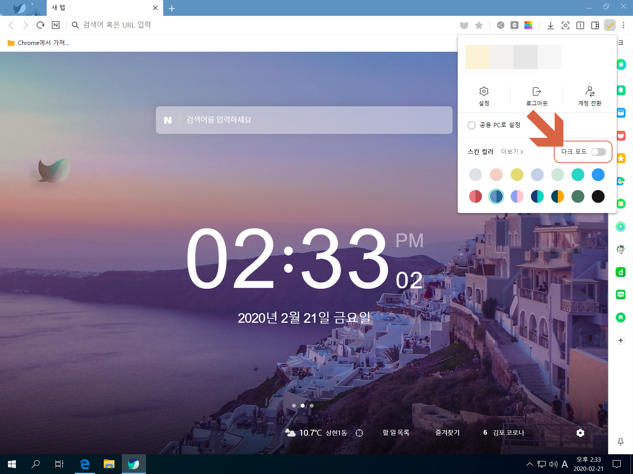 다크 모드를 선택하면 웨일 브라우저 창이 어둡게 변합니다.