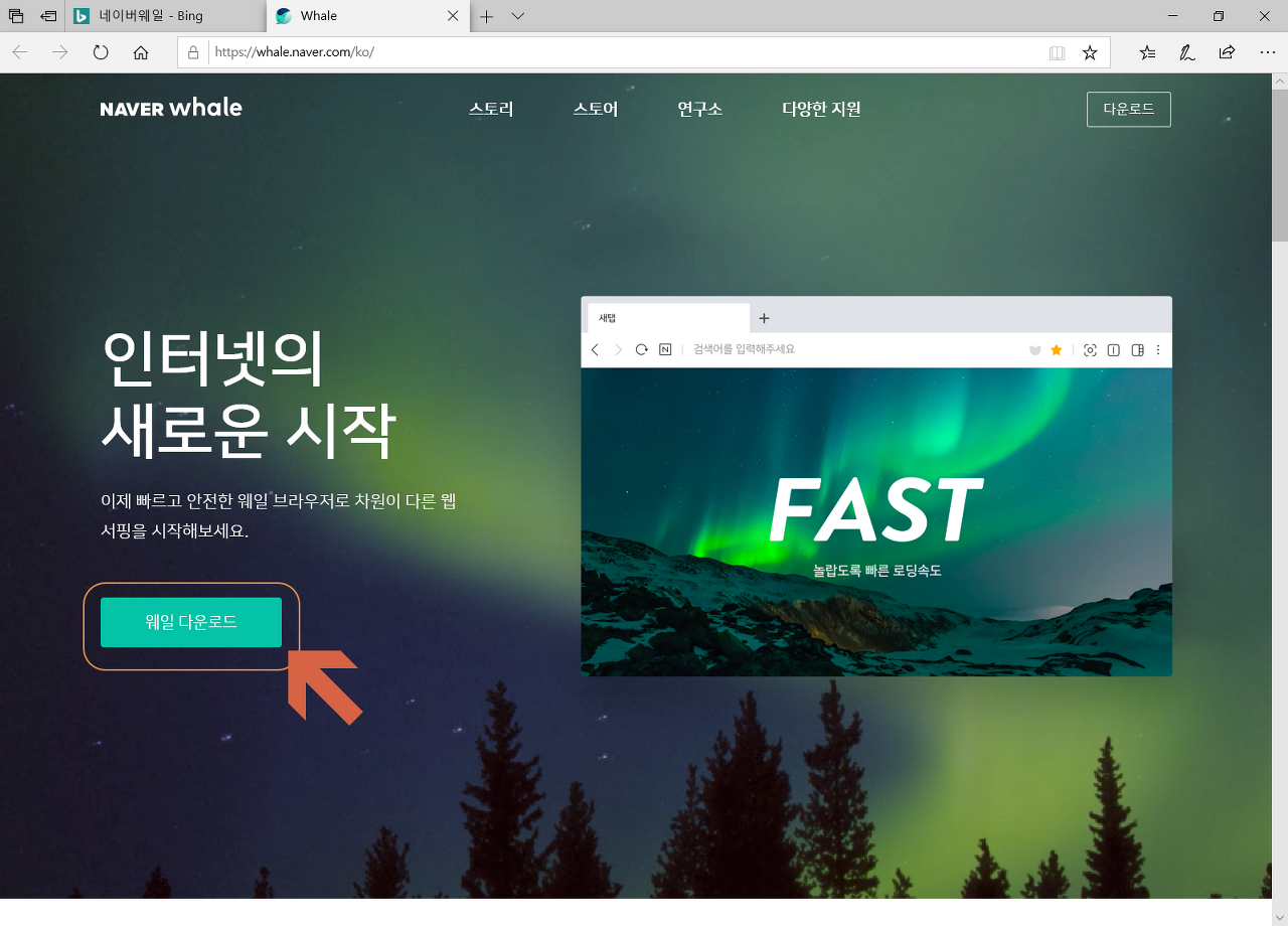 네이버 웨일 사이트로 접속합니다. 이 페이지 하단에 바로가기 링크가 있습니다.