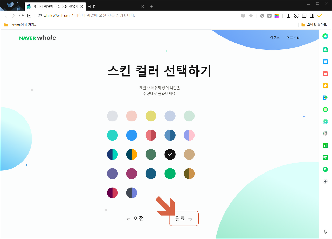 웨일 브라우저 창의 색깔을 취향에 맞게 고르고, <완료>를 누릅니다.