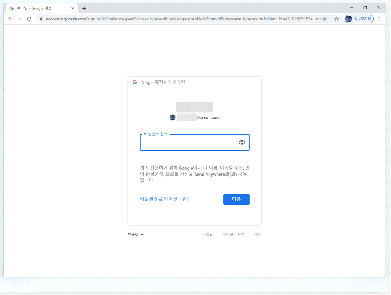 비밀번호를 입력하고 <다음>을 누릅니다.