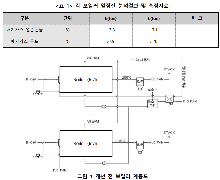 이로 인하여 배기가스 손실열이 13.3%, 17.1%로 크게 발생하고 있지만, 이 고온의 배기가스 폐열을 회수하지 못하고 있음.