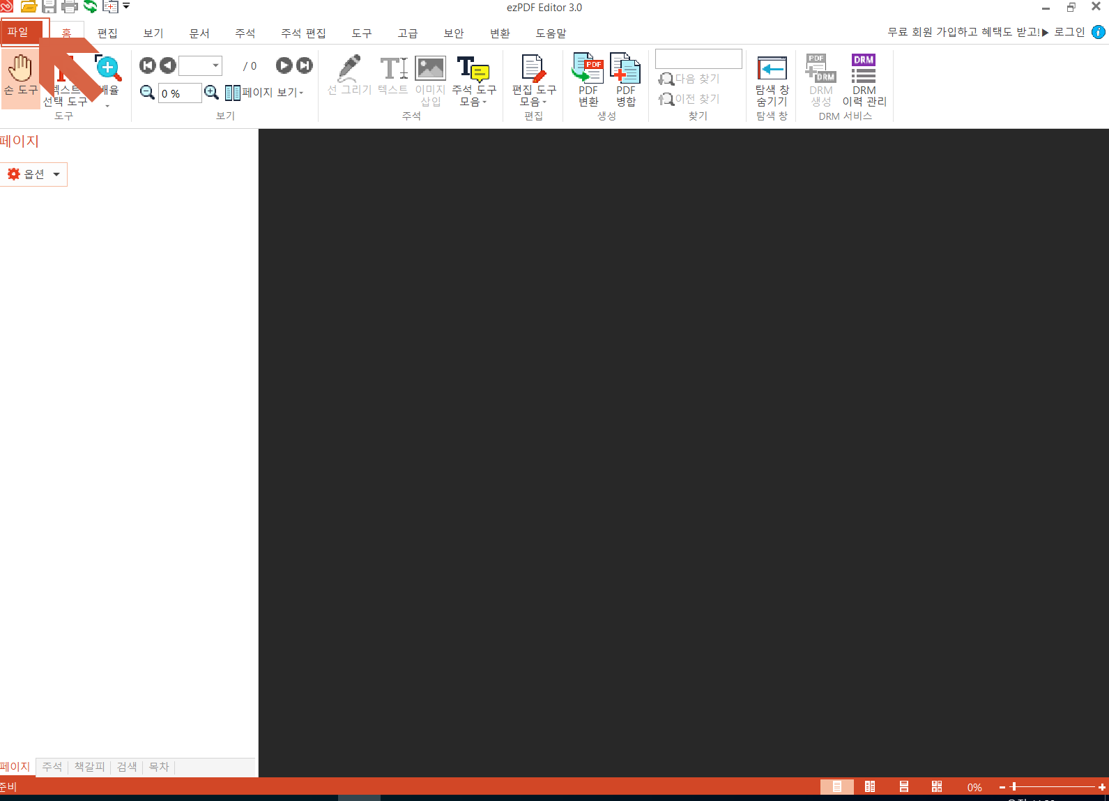 기존 어도비 PDF 프로그램과는 모양이 살짝 다르죠. 국산 개발 프로그램이라서인지 조금 더 친근감이 가는 UI를 보이고 있습니다. 상단 좌측에 <파일>을 눌러줍니다.