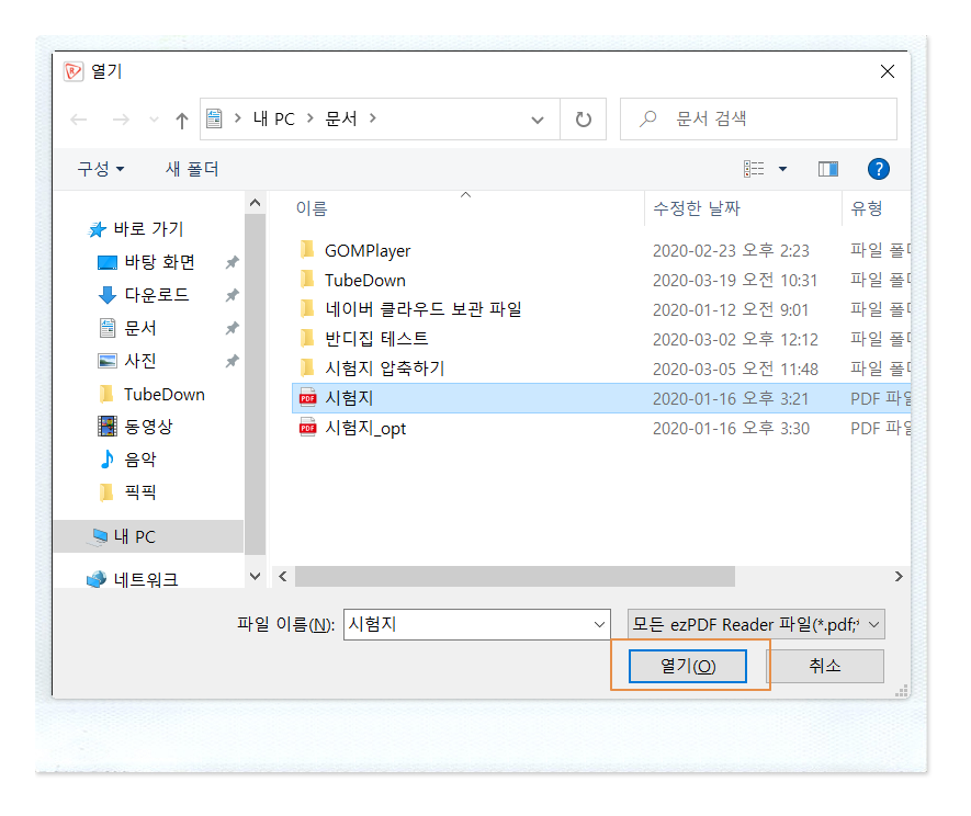 PDF 파일을 선택하고 <열기>를 누릅니다.