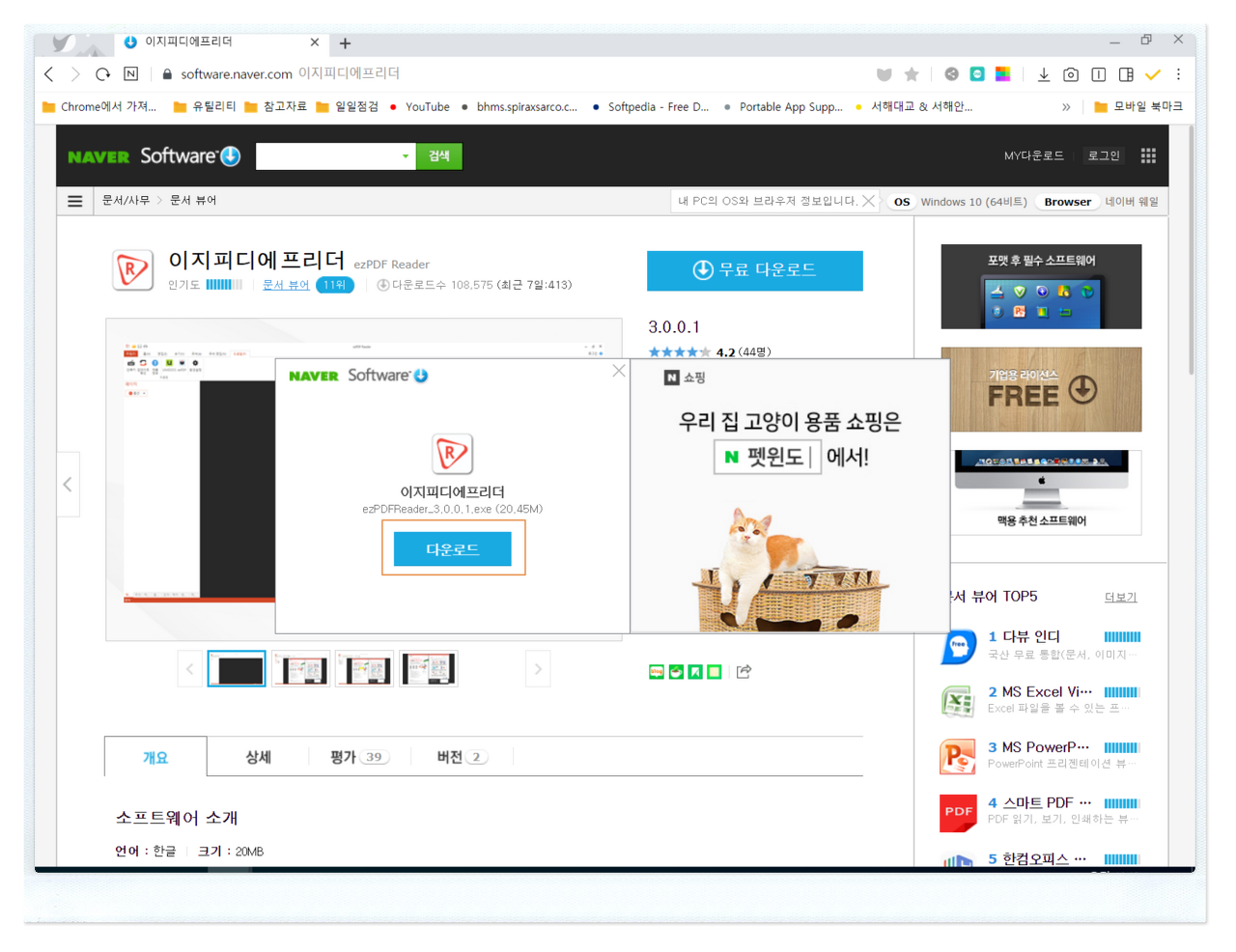 네이버 소프트웨어 자료실로 이동합니다. 이지피디에프리더를 다운로드 가능한 페이지로 이동한 후 <무료 다운로드>를 누릅니다.